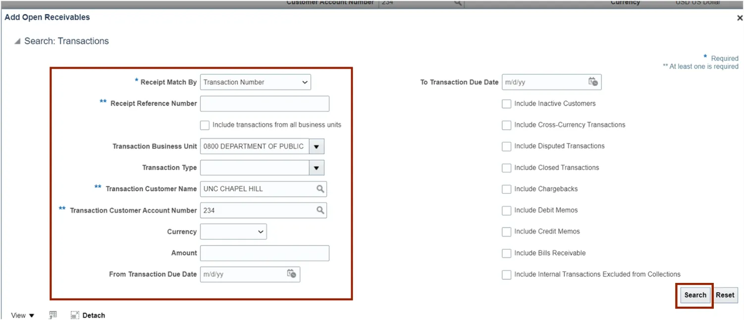 Step 9. On the Add Open Receivables pop-up page, enter the required fields. Click the Search button.