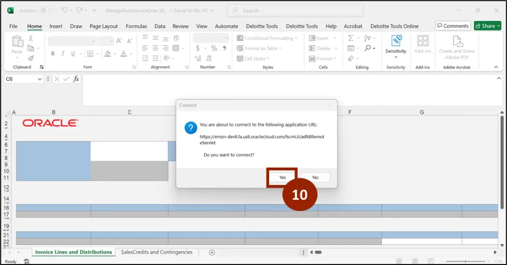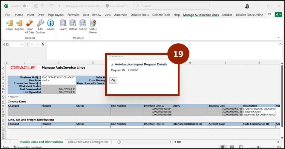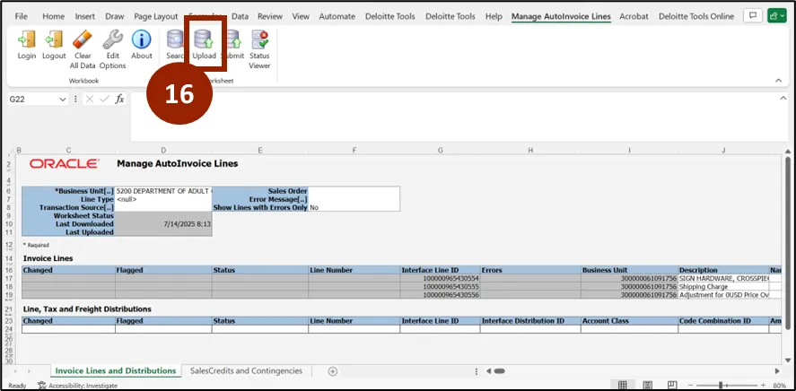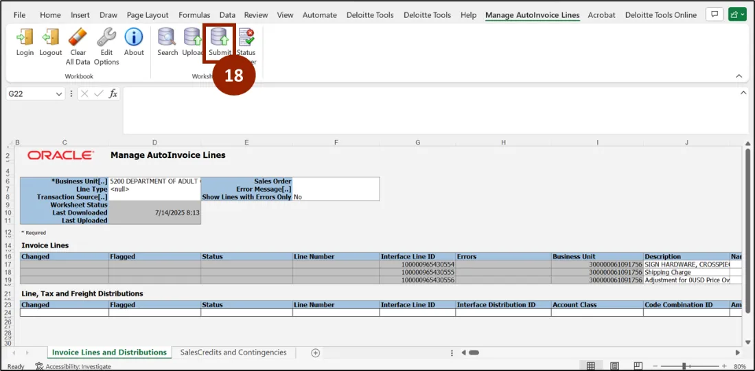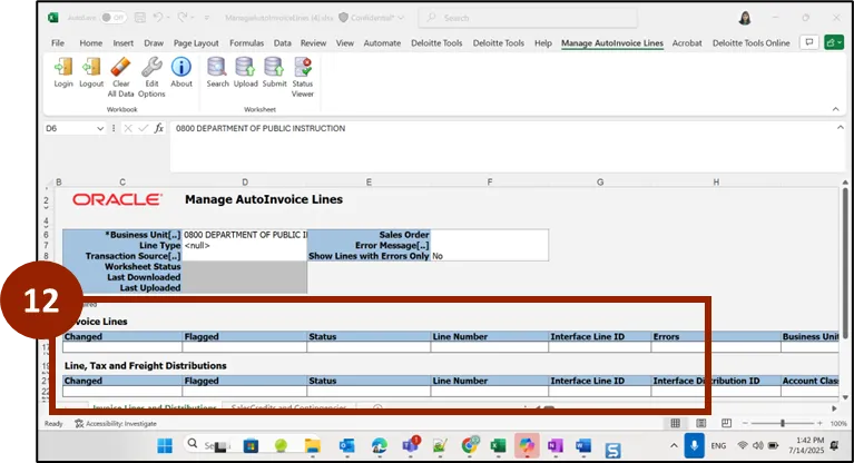 Step 12. The spreadsheet opens, and displays the Invoice Lines, Lines, Tax, and Freight Distributions.