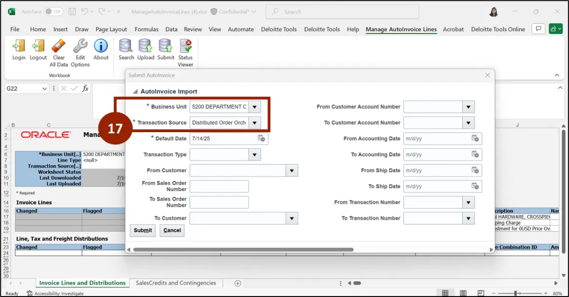 Step 17. To submit the AutoInvoice, select 5200 Department of Adult Correction as the Business Unit and Distributed Order Orchestration as the Transaction Source.