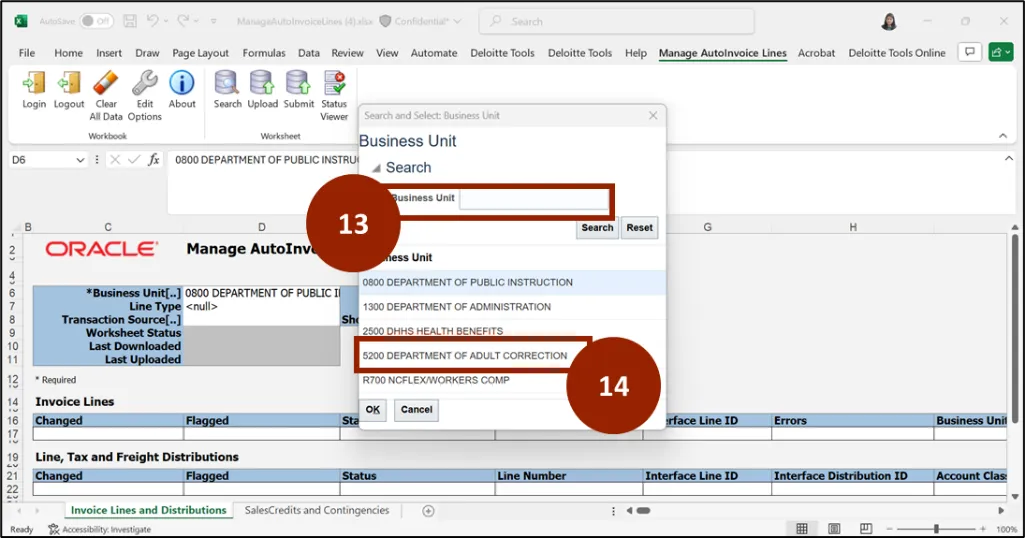 Step 14. From the drop-down, select 5200 – Department of Adult Correction to display any error lines for the relevant sales order.