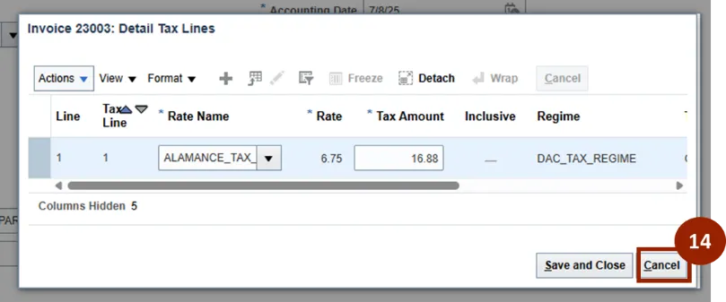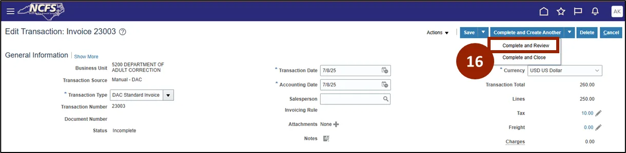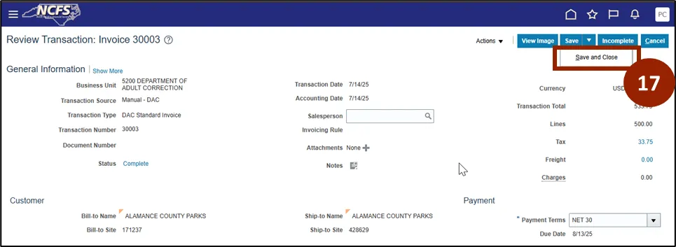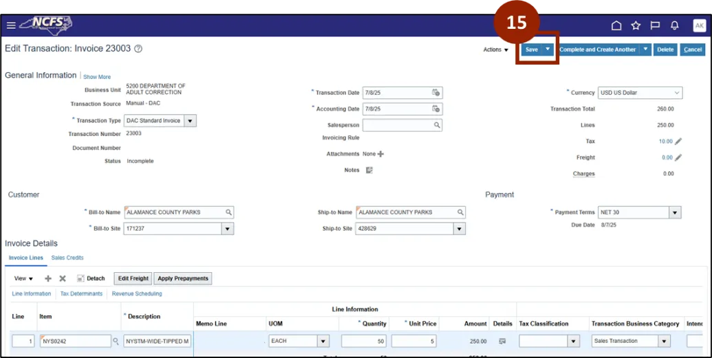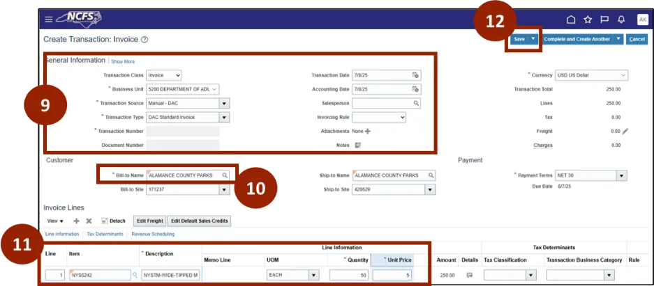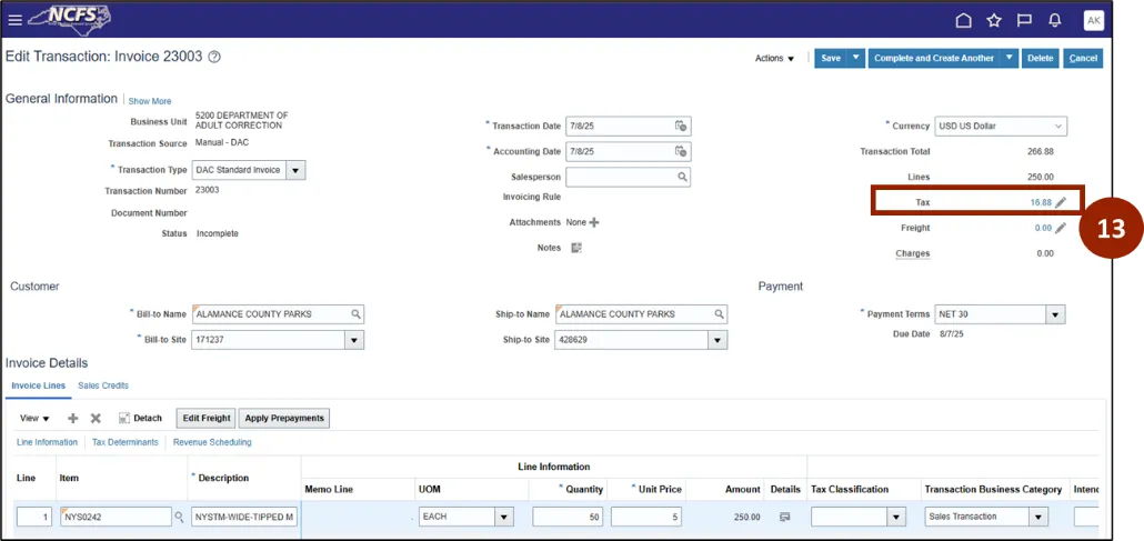 NOTE: NCFS automatically calculates applicable taxes based on customer location. The calculated tax appears in the Tax Details or Tax Summary section.
