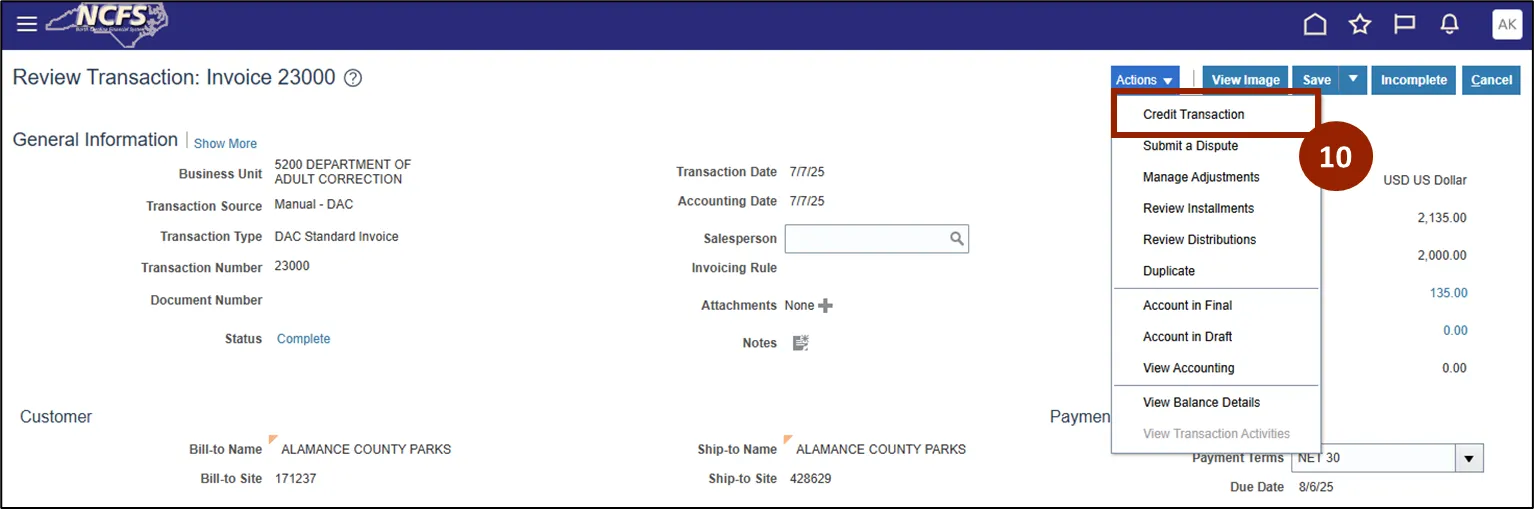 Step 10.    Click Credit Transaction from the Actions list.