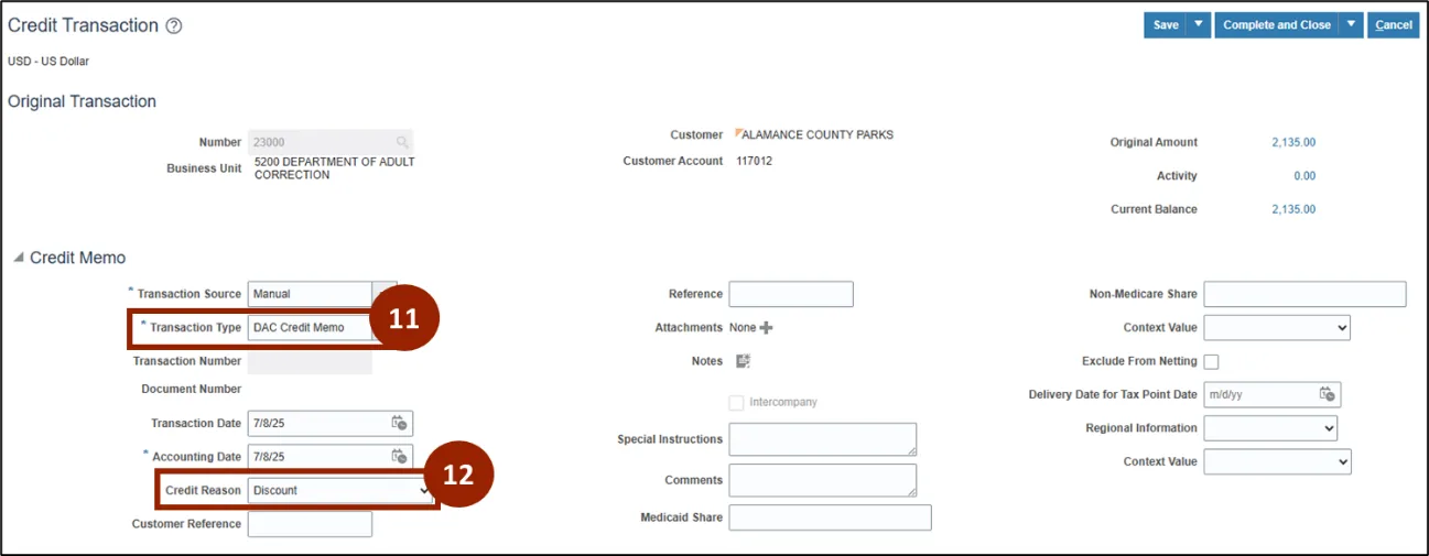 Step 11.    Enter DAC Credit Memo in the Transaction Type field.
