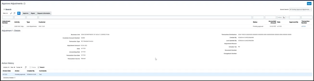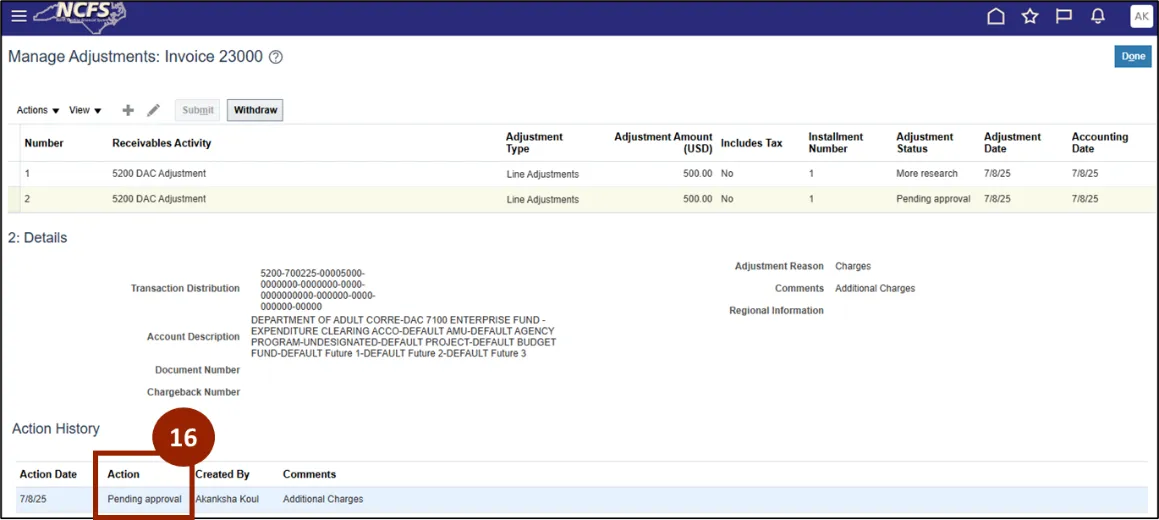 Step 16.    Once the adjustment is created, it is automatically routed to the designated approver for review.
