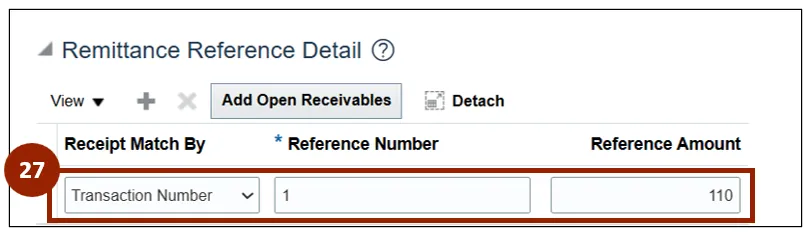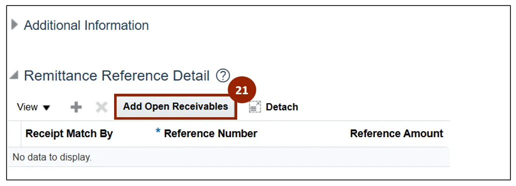 Step 21. Within the Remittance Reference Detail section, click the Add Open Receivables button to apply the invoices against the receipt.