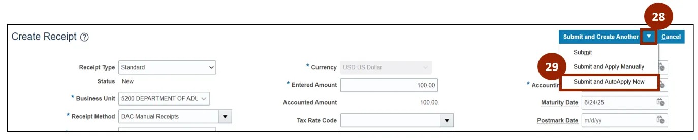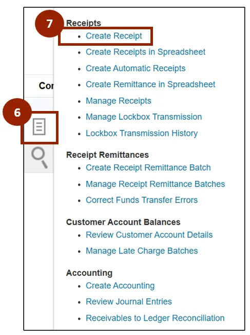 The manual approach allows users to create and apply receipts individually within NCFS. This method provides users with full control over receipt details, customer information, and the application of payments to specific invoices. To create receipts using the manual approach in NCFS, please follow the steps below. There are 30 steps to complete this process.