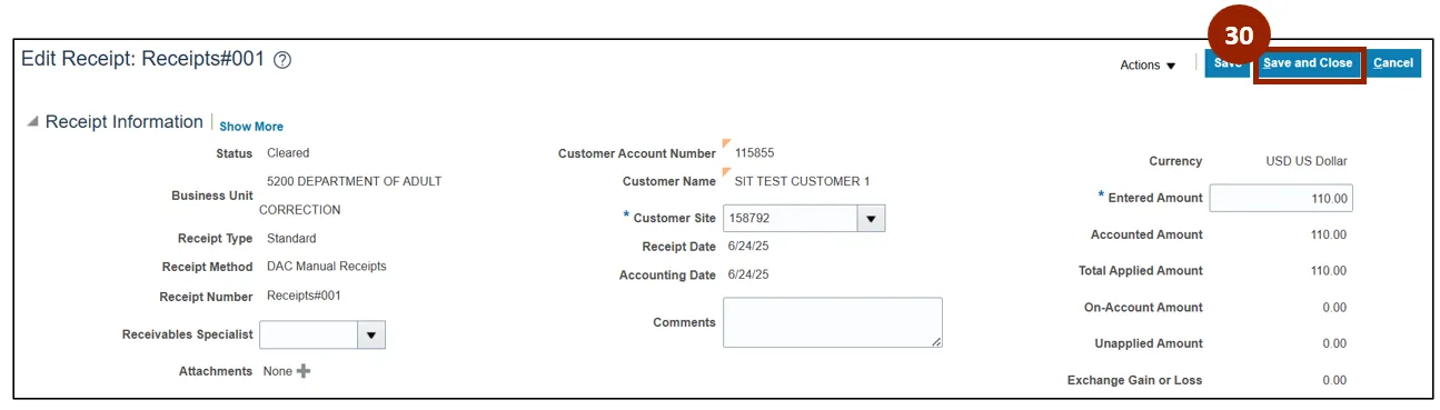 Step 30. The Edit Receipt screen displays for the submitted receipt record. Click the Save and Close button.