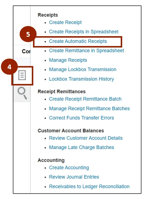 Step 5. Under the Receipts heading, click Create Automatic Receipts to open the Create Automatic Receipt Batch screen.
