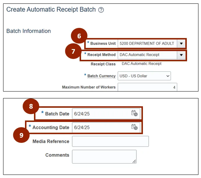 Step 7. In the Receipt Method drop-down field, select DAC Automatic Receipt.