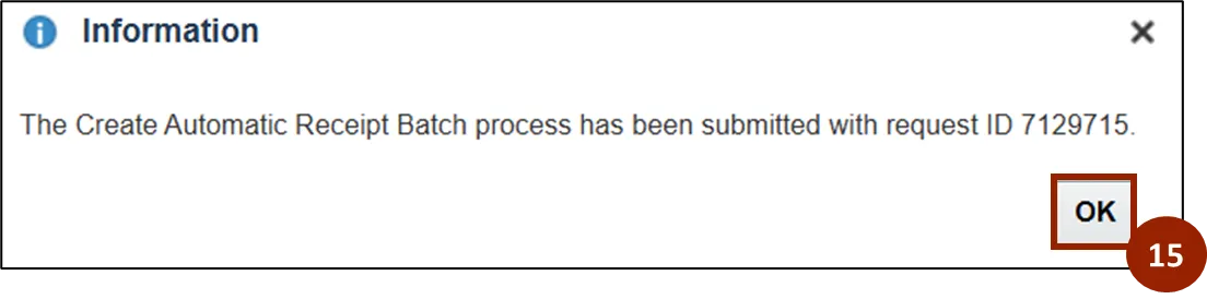 Note: The Information pop-up screen will display your submission details and provide the request ID while the automatic receipt batch approval is being processed.