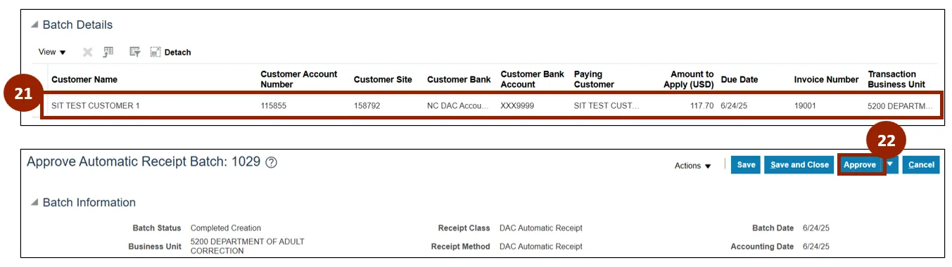 Step 21. The Batch Details section displays a table containing all record-level information related to the receipt batch.