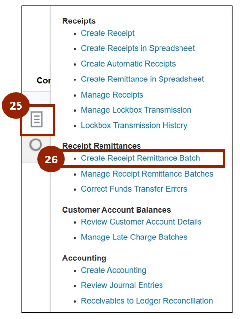 Step 26. Under the Receipt Remittances heading, click Create Receipt Remittance Batch.