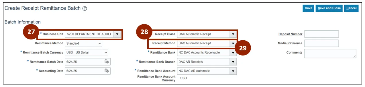 Step 28. In the Receipt Class drop-down field, select DAC Automatic Receipt.