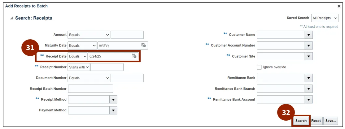 Note: At least one field marked with a double asterisk (**) must be entered to search for a receipt. While this example uses the Remittance Batch Number field, any marked field may be used.