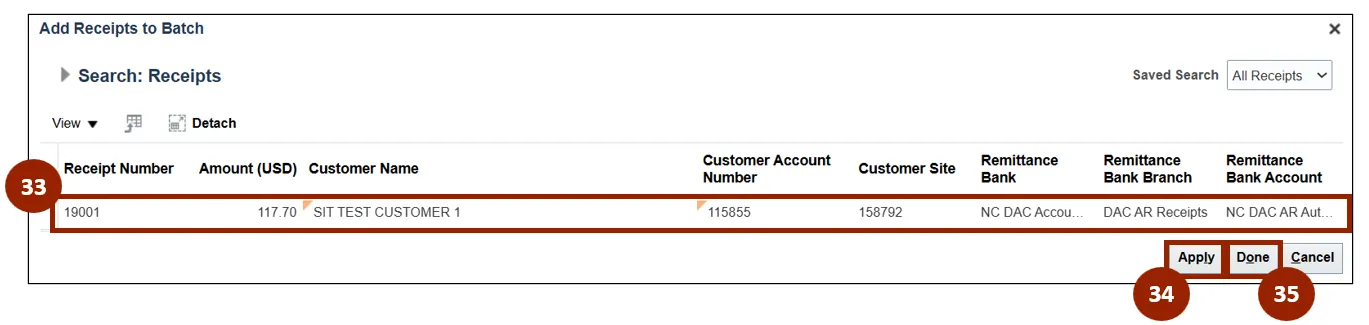 Step 36. Within the Receipts table, verify that the applied receipt has been added.