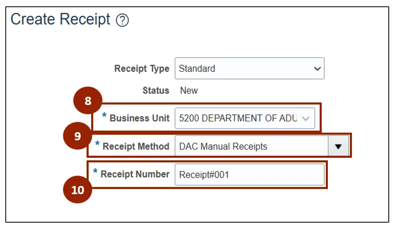 Step 10. In the Receipt Number field, enter the receipt’s unique identifying number.