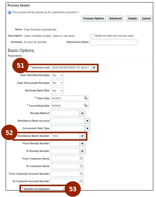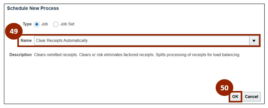 Step 49. On the Schedule New Process window, enter or select Clear Receipts Automatically within the Name field.