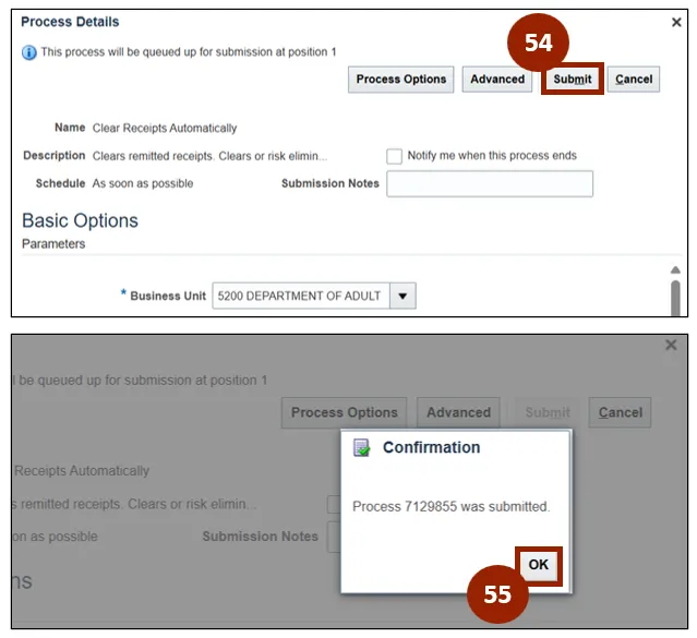 Step 55. Once submitted, a Confirmation pop-up window appears on screen, click OK to close the message.