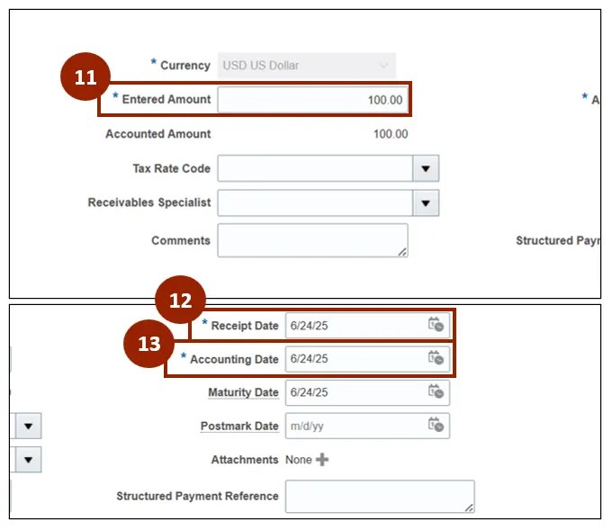 Step 12. In the Receipt Date and Accounting Date fields, enter or select the date of the receipt and appropriate accounting date.