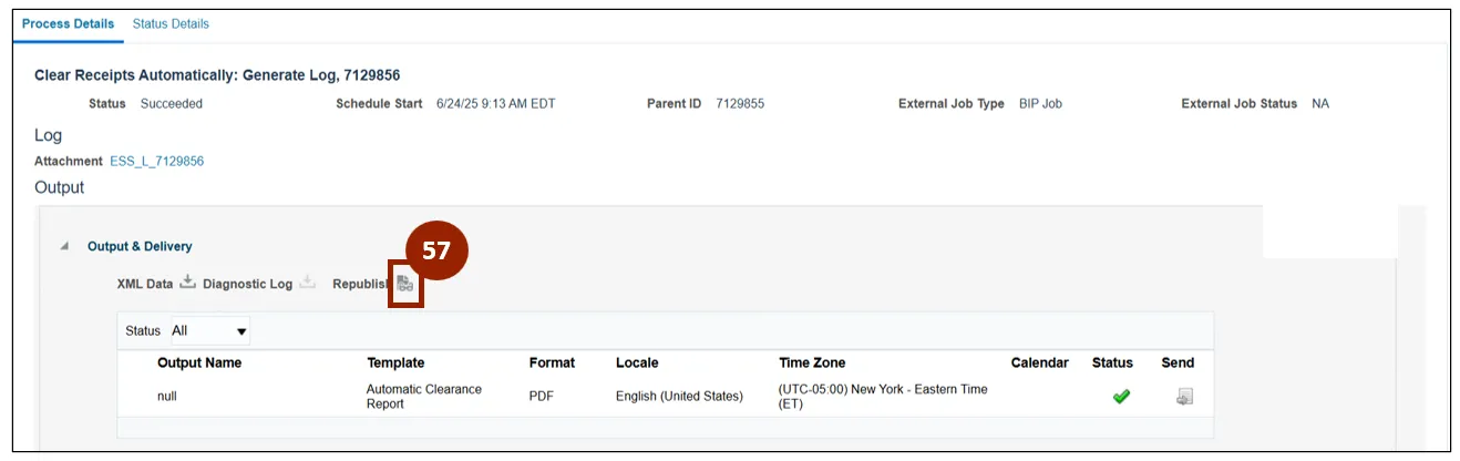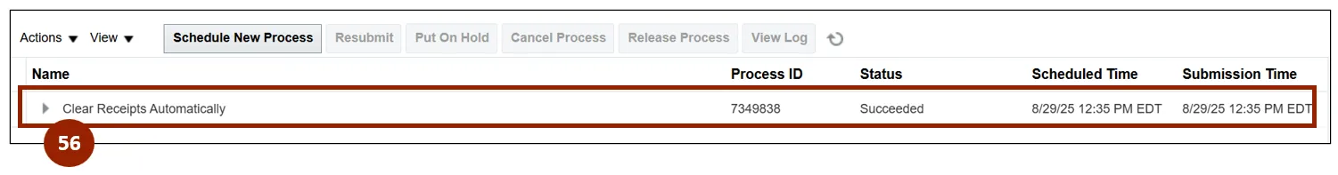 Step 56. Within the Overview screen of the Scheduled Processes application, select the created clear receipts automatically process from the Search Results list.