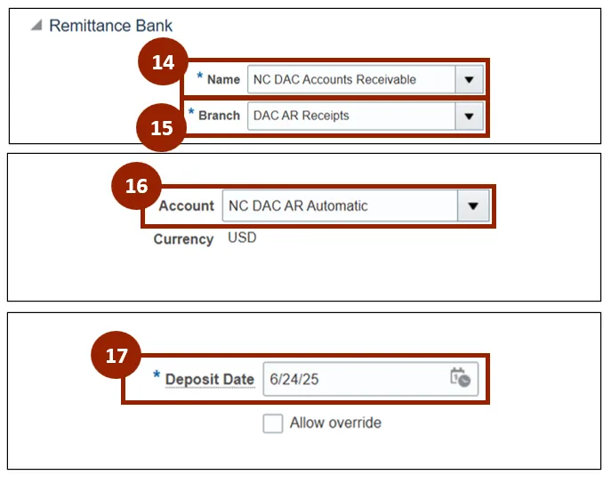 Step 14. Within the Remittance Bank section under the Name drop-down field, select NC DAC Accounts Receivable.