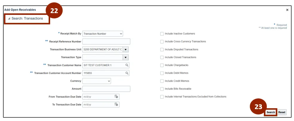 Step 22. In the Search: Transactions section of the Add Open Receivables window, click the caret icon to expand the search options.