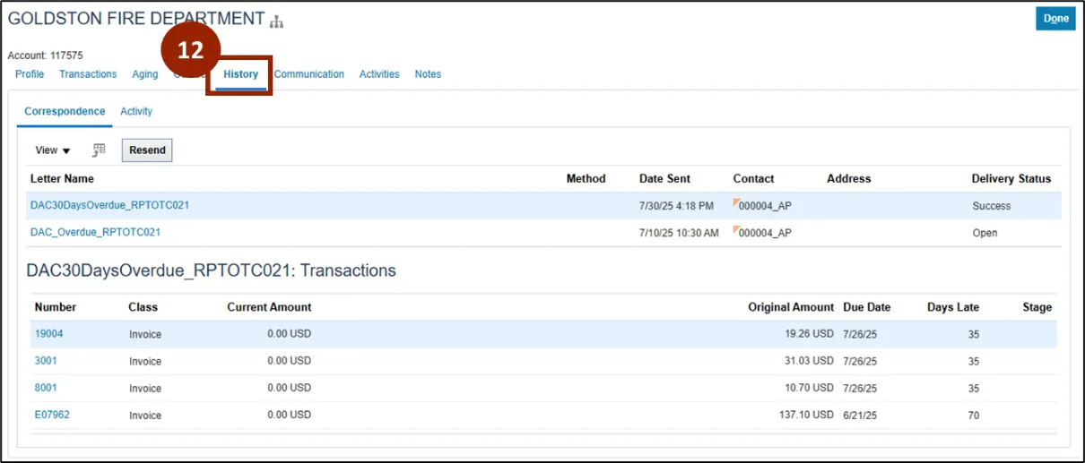 Step 13. On the Correspondence tab view all Dunning Letters sent, including Letter Name, Date Sent, Contact, and Delivery Status.