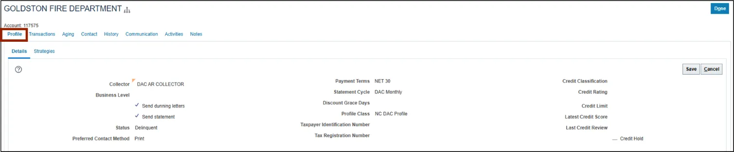 Within the Profile tab of the Customer page, Collectors will find important customer information that provides insight into a customer’s background, contact preferences, and risk level at a glance. This tab focuses on high-level data rather than transactional details.
