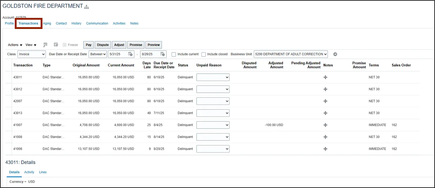 Within the Transactions tab of the Customer page, Collectors have quick access to customer information, such as outstanding balances, payment history, and other relevant transactions details.