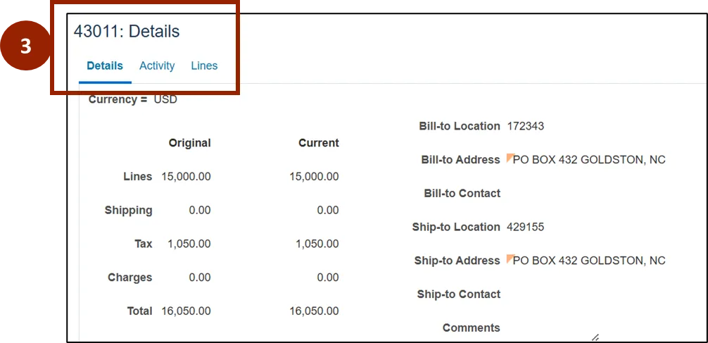 •    The Details tab contains fields with bill-to information, ship-to information, and related charges.