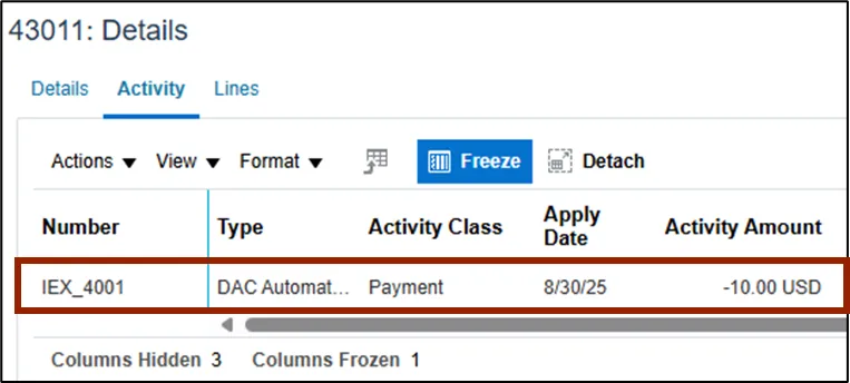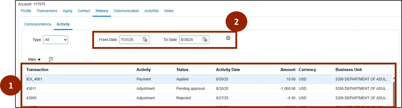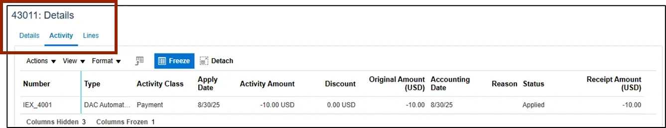 •    The Activity tab indicates whether the customer has made a payment or adjustment for this transaction.