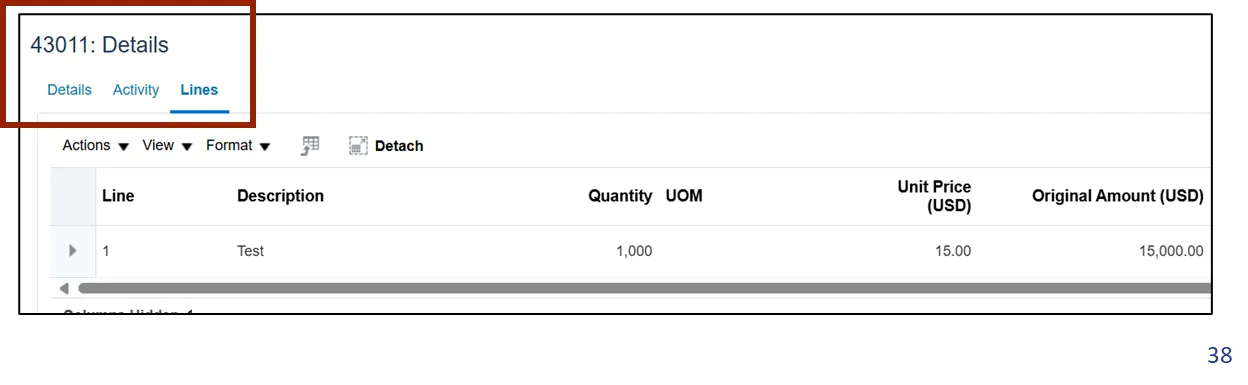 •    The Lines tab displays the number of lines in the transaction and includes the unit of measurement, unit price, and original amount.
