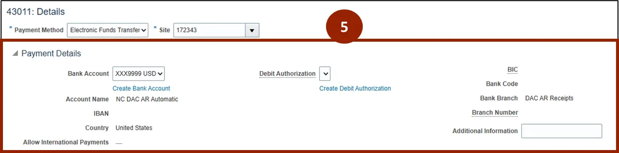 Step 5.    If the payment selected is Electronic Funds Transfer, Payment Details will populate for review, including bank account information and debit authorization.