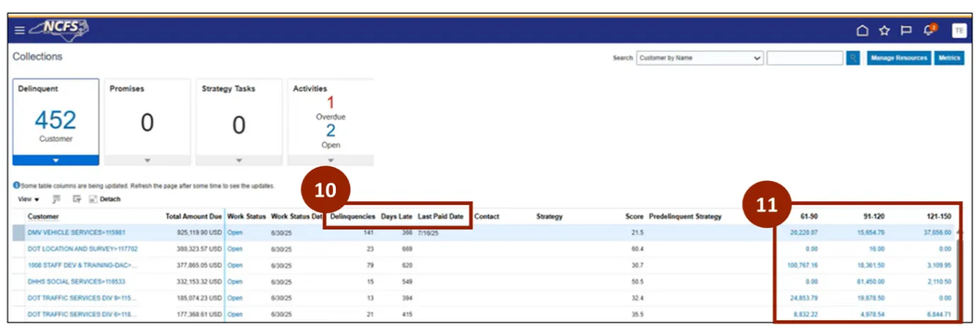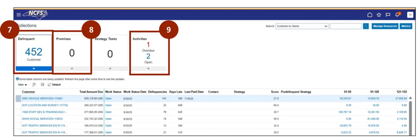 NCFS users can manage collections by navigating the Collections Manager dashboard. Where they can access key tasks, review customer information, and complete collection activities efficiently.