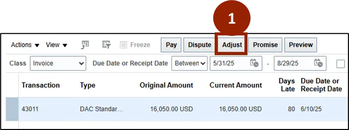 Step 1.    Click the Adjust button within the transactions tab on the Customer page.