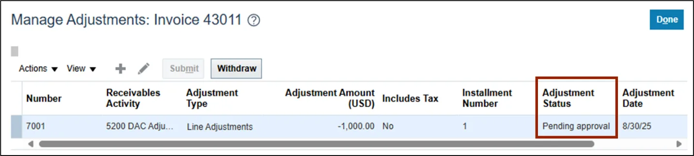 •    The adjustment will be displayed in the Manage Adjustments table, and the status will say Pending Approval.