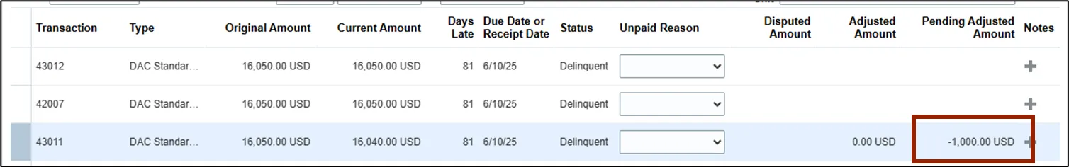 •    The Pending Adjusted Amount column in the Transactions table on the main Transactions tab reflects the pending adjustment amount.