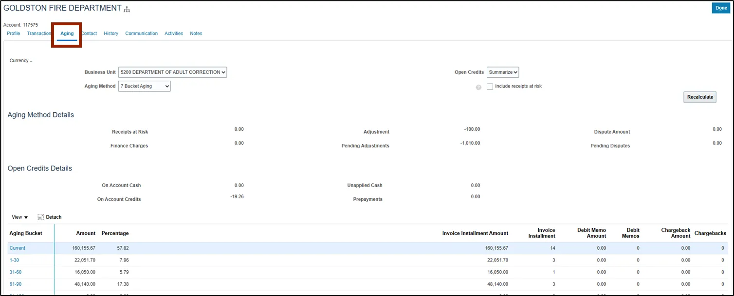 Step 5.    The options selected will be applied to the Aging Bucket table and you will be able to see information such as Invoice Installment Amount, Invoice Installment number, and Debit Memo Amount for each aging bucket.