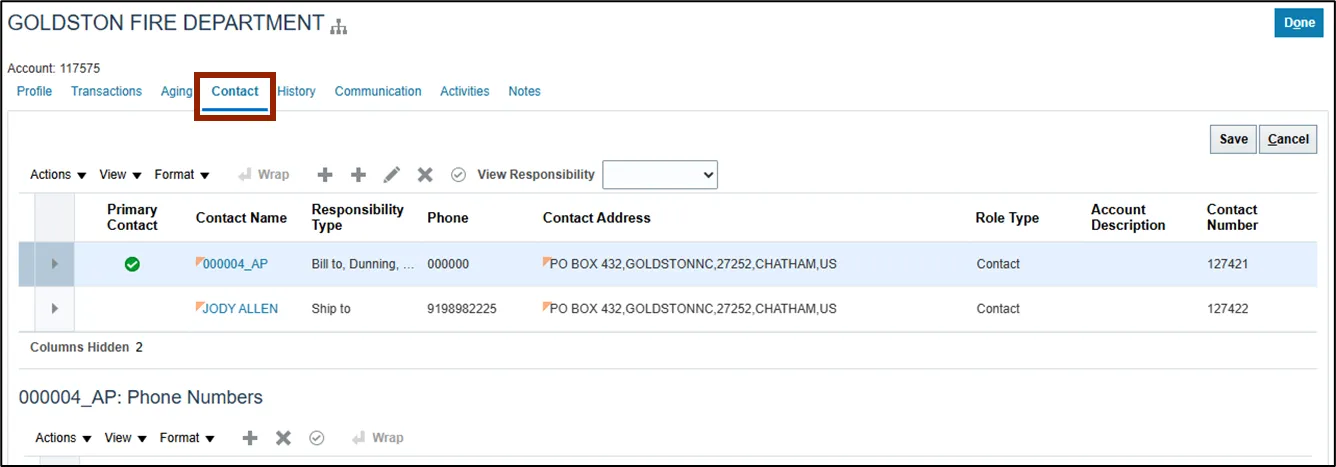 Within the Contact tab of the Customer page, Collectors have quick access to all relevant contacts associated with a customer account. This tab centralizes communication details, making it easier to reach out for collections, dispute resolution, or general account inquiries.