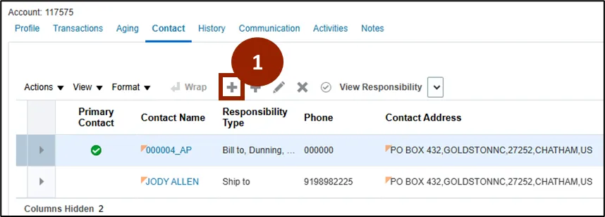 Step 1.    Click the Plus (+) icon in the table of contacts within the Contact tab within the Customer page.