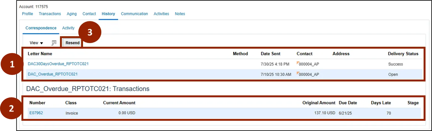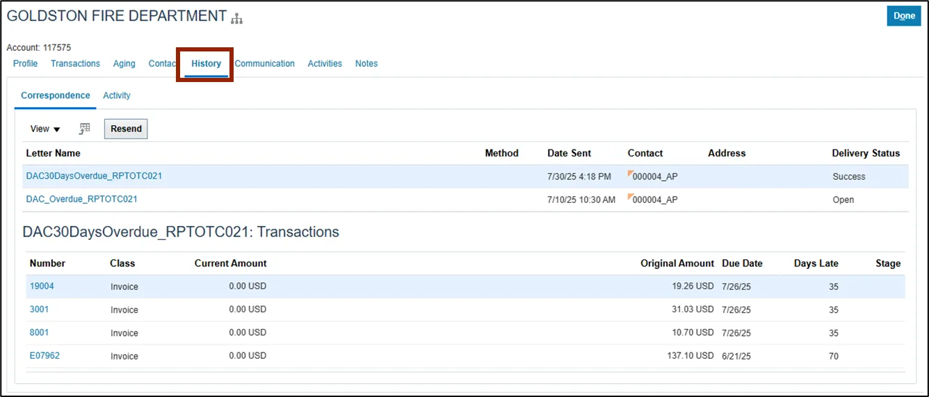 Step 1.    View all Dunning Letters sent, including Letter Name, Date Sent, Contact, and Delivery Status.