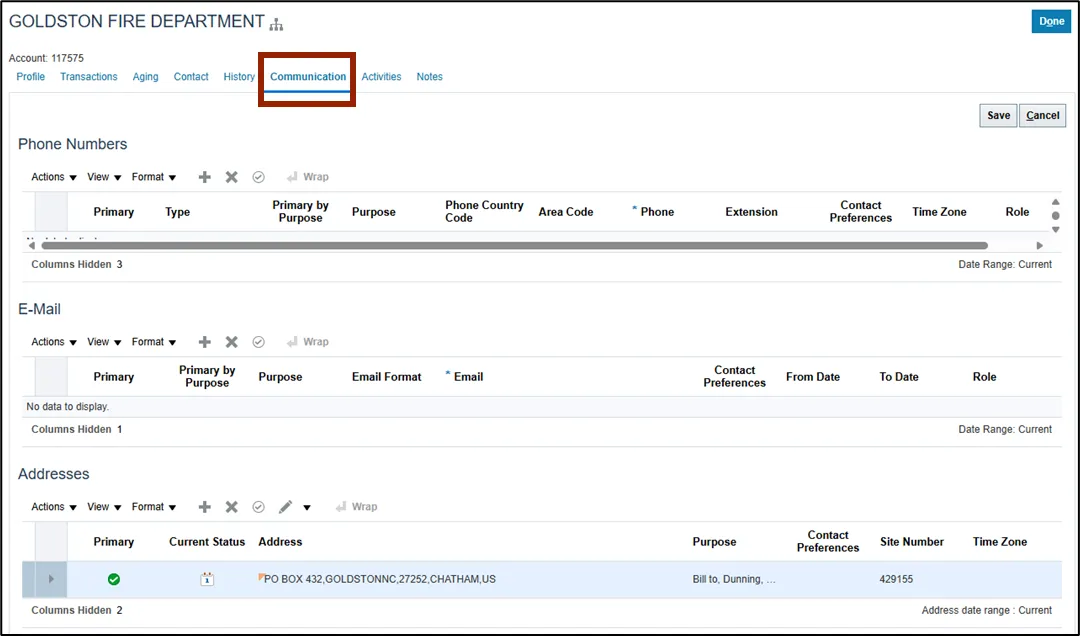 Within the Communication tab of the Customer page, Collectors can see all phone numbers, e-mail addresses, and physical addresses associated with the Customer account.
