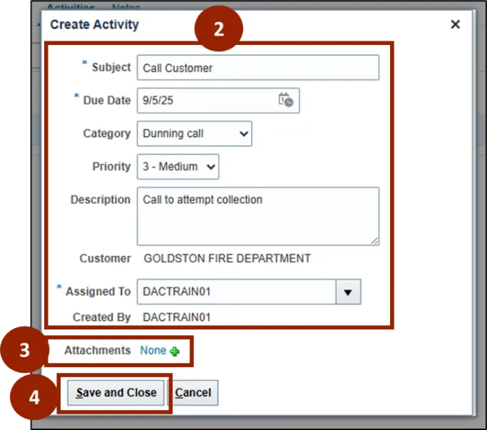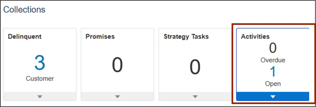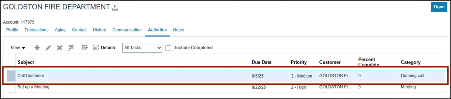 Within the Activities tab of the Customer page, Collectors can manage existing tasks and schedule follow-ups related to the Customer’s account. This helps ensure timely completion of critical activities.
