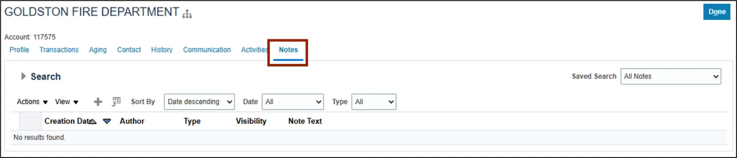 Within the Notes tab of the Customer page, Collectors can document important details within the Customer’s account. This feature allows Collectors to document important information, interactions, and collection efforts related to a specific customer, enabling comprehensive tracking and management of the customer relationship.