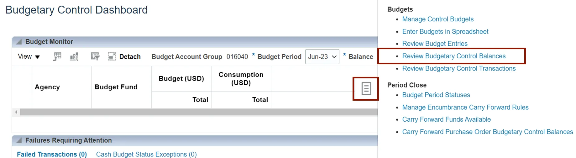 Step 3. On the Budgetary Control Dashboard page, click the Tasks icon, and click Review Budgetary Control Balances.