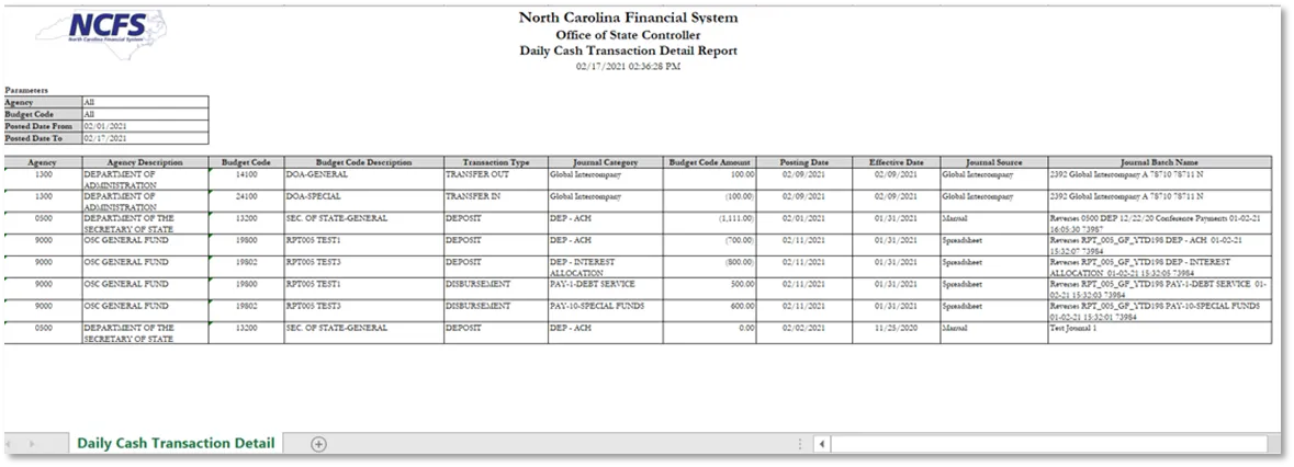 This Quick Reference Guide covers the navigation to the Daily Cash Transactions Detail Report and how to generate the report output. The Daily Cash Transactions Detail Report provides the detailed transaction information related to all cash transactions posted to a specific cash account by Budget code. This report lists all deposits, disbursements (requisitions), and transfers that have posted to the North Carolina Financial System.