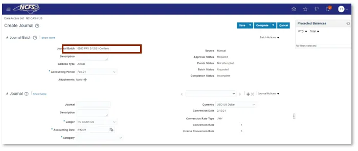 Step 5. Enter the Journal Batch details. Users should include the agency, transaction type (DEP or PAY), entry date in MMDDYY format and a short description. Ex: 0800 PAY 2/12/21 Conference Fees.