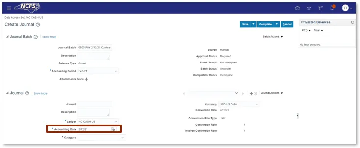 Journal Batch and Attachments are not system requires fields but still can be entered. The Journal Batch name must be unique and include only one journal for each batch.