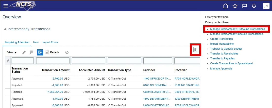 This QRG covers how to Resolve Rejected Intercompany Transfers in the NCFS. A transfer can be resolved only when it is rejected due to an error, after it has been submitted for approval.