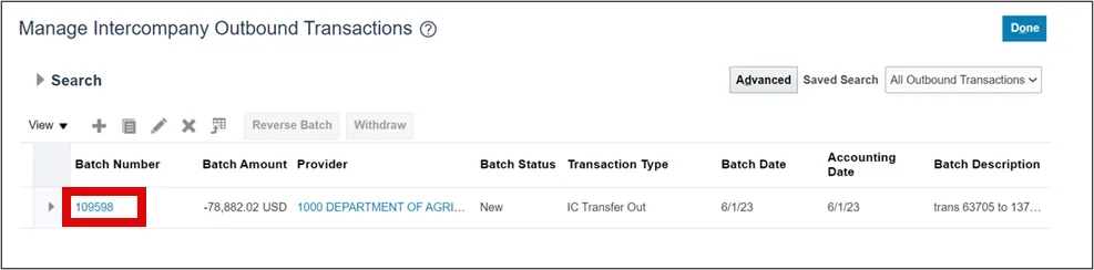 Step 10. On the Manage Intercompany Outbound Transactions page enter the new Batch Number in the search criteria field and select the Search button.